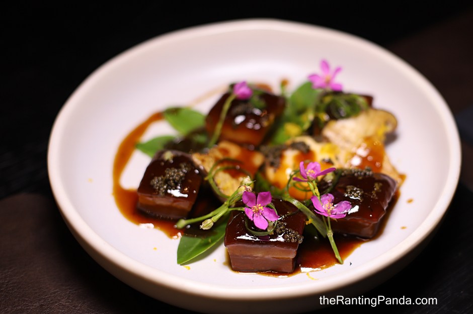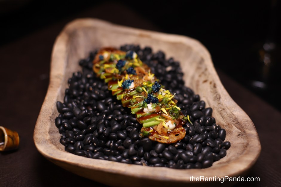 Another of those snacks which I don’t mind multiple servings, the Tempura Crepe (S$25/piece) is a crispy cracker of Scampi Roe, Avocado, Flying Fish Roe, Sakura Ebi, Ao-Togarashi Yoghurt Balsamic-Teriyaki Sauce, Hojiso Flowers from the 1-Arden Food Forest and Chrysanthemum petals. Loads of ingredients packed into one long crispy slab of tempura dish!