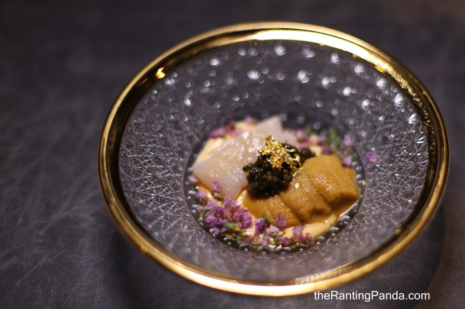 I had the 10-course dinner menu and started with Appetiser, a gorgeous display of Murasaki Uni and Tairagai (Japanese Pen Shell) from Hokkaido. It is topped with Kristal caviar and served on a homemade egg-yolk sauce, where the freshness of the ingredients is evident.