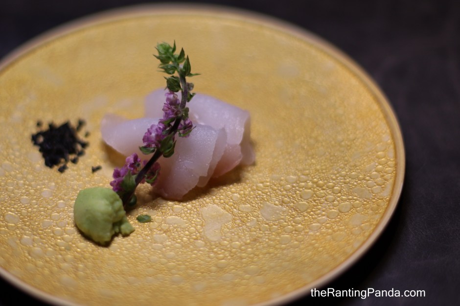 The next course is a Steam dish, also one of chef’s signature dishes – Kuro Awabi. Also know as black abalone, you get an abalone dashi made with black abalone from Yamaguchi, konbu and sake, with no salt or sugar added along with steamed sliced black abalone with abalone liver sauce fortified with uni. The abalone is steamed for 4 hours, and topped with some wasabi. I personally prefer to have it without the wasabi which masks the good flavour of the abalone liver sauce.