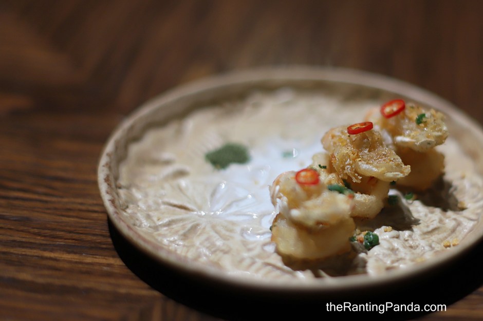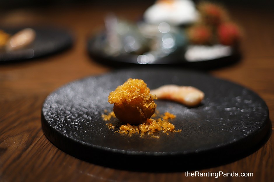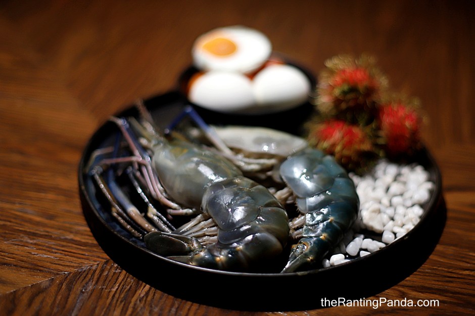 “Surat Thani” – Tapee river prawn, rambutan, salted egg. The style of presentation for some courses is that the staff will present the ingredients used in the dish so you get a visual representation, which is great.