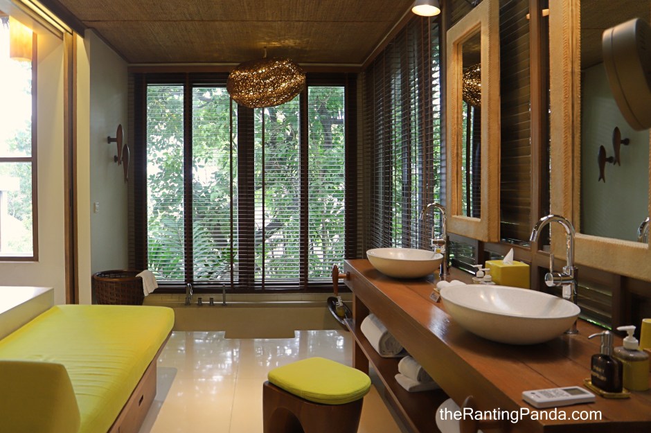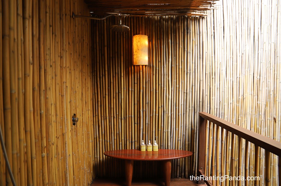 There is a built-in tub which is spacious enough for two people to soak in, double vanity mirrors and sinks, and an outdoor shower area at the end which is designed out of bamboo.