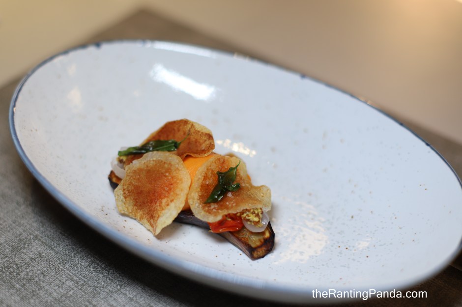Next up is a Starter dish, where I had the Aubergine with red curry sorbert, pearl onions and sun-dried cherry tomatoes. I love this dish. You get a very tangy Thai red curry flavour which is the highlight of this dish for me, much more than the Japanese eggplant. It is topped with some in-house made potato chips for an added crunch.