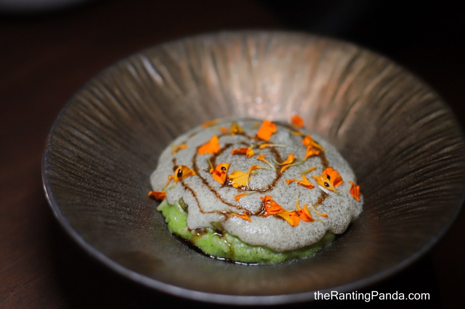 My first course is the Oscietra Caviar, Sea Urchin Ice Cream, and Red Prawn Waffle (Supplement of S$20 (with 15g caviar) for the Experience Menu). It is quite the divine combination for me – creamy Uni ice cream along with the indulgent caviar just go so well together. That red prawn waffle is crispy and the freshness of the prawn is evident.
