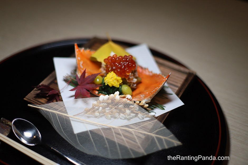 This is a showcase of a trio comprising of Watarigani (Blue Crab from Ehime), Nama Sujiko (Fresh Salmon Roe Sac from Hokkaido) and Ginnan (Gingko Nuts from Aichi). The main element is undoubtedly the blue crab where the salmon roe and nuts are accompanying ingredients. Pretty and vibrant colours on display here in terms of presentation to herald autumn.