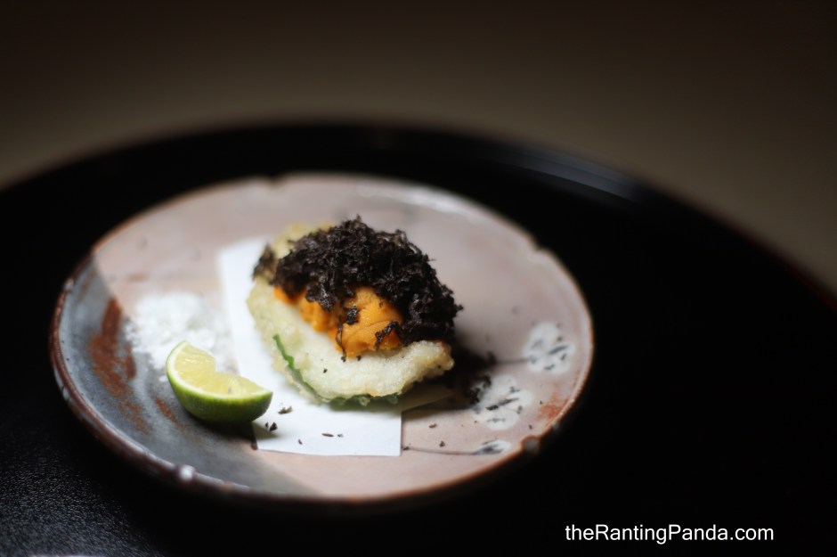 First up was the Kinki (Thornhead-fish from Hokkaido) fish tempura rested on Oba (Green Perilla Leave) leave. Nice crisp texture of the tempura here, topped with decadent Bafun Uni (Sea Urchin from Hokkaido) and Black Truffle which accentuates the flavour of the tempura.
