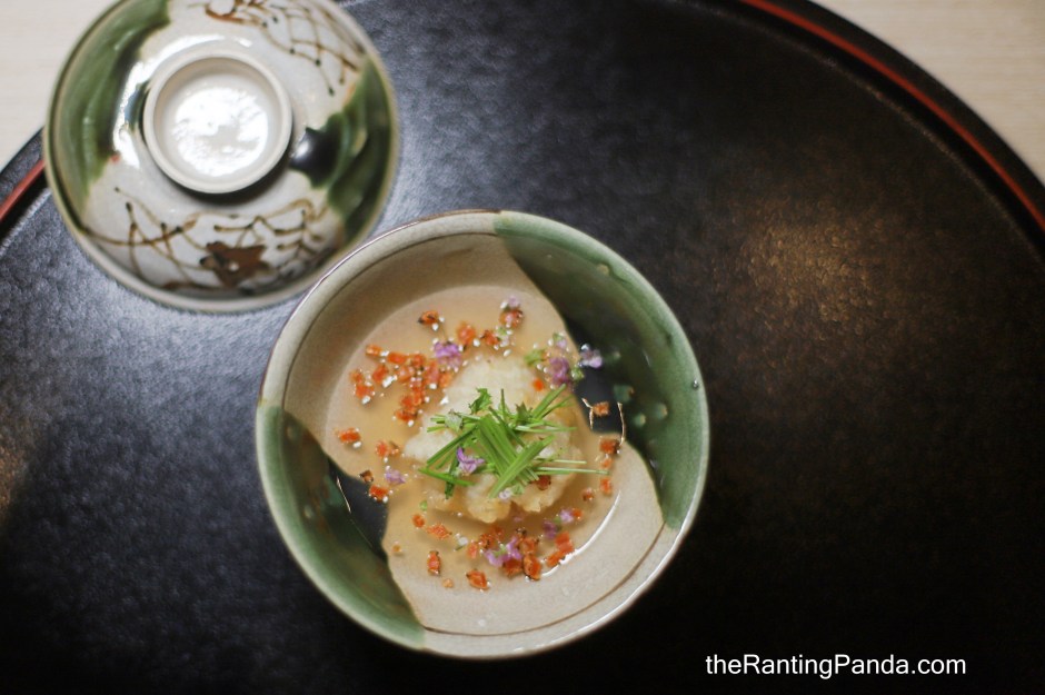 I had four types of sashimi here – Kinmedai (Golden Eye Snapper from Chiba), Kuromutsu (Black Gbome Seaperch), Katsuo (Bonito from Chiba) and Anago (Sea Eel). The anago is grilled over binchotan so you get that smoky flavour as well. And the surprise for me here is the sashimi “sandwich” where the Kinmedai is tucked and hidden under, wrapped in a white kombu, which is edible as well. It is an interesting presentation for me as it was my first time seeing sashimi wrapped this way.
