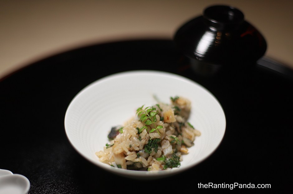 The last savoury course is a claypot rice with Managatsuo (Japanese Butter-fish from Ehime) cooked with four kinds of mushroom sauce (Shimeji, Maitake, Shiitake and Kakinokidake) along with spring onion.