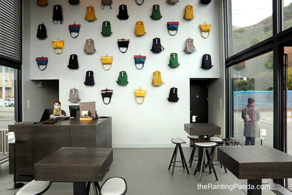 The reception design spots a sleek minimalist look and the most interesting bit are the colourful backpacks which decorate one side of the front desk wall.