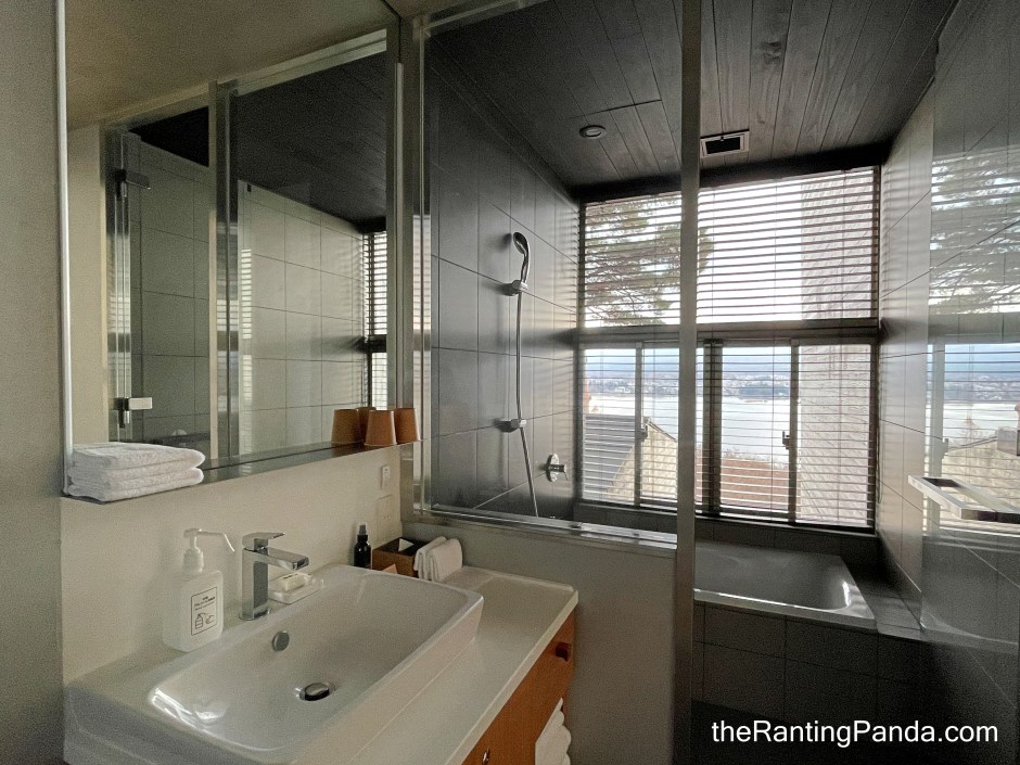 The bathroom spots a simple design and comes with a bathtub with same view as the bedroom. It also has a Japanese-style bathing stool to sit on if that is your preferred shower style.