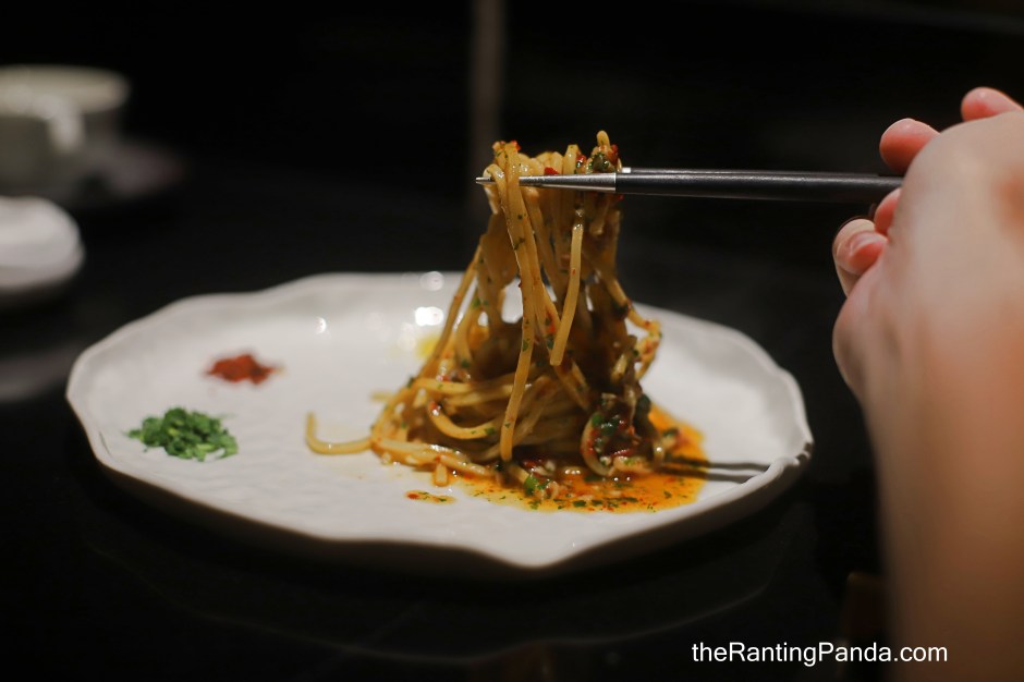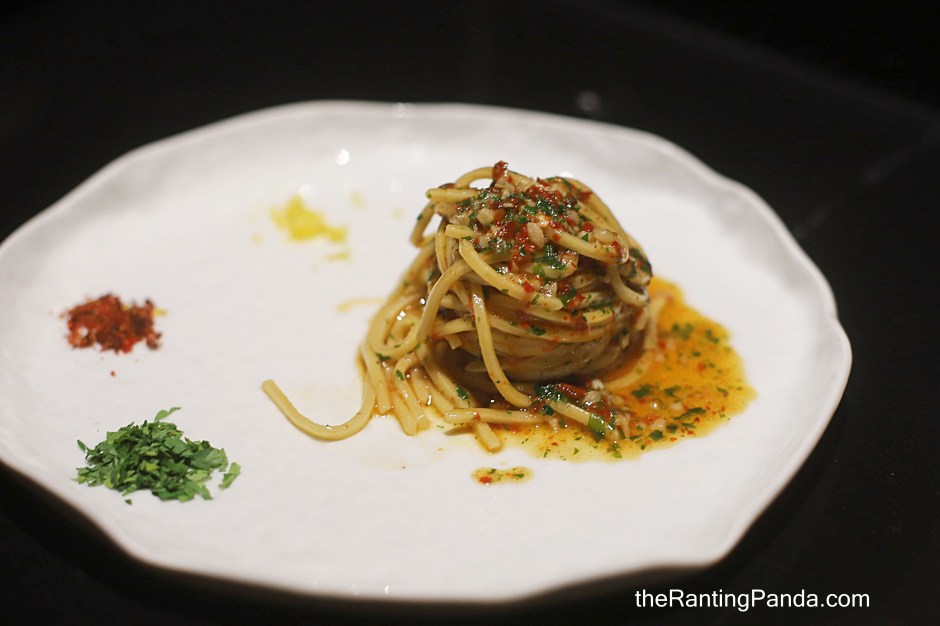 Before dessert was served, I was told that there was a bonus pasta dish. This is chef’s secret noodles dish of Aglio Olio, prepared for eight hours with three types of chicken including French organic chicken. The handmade pasta is then cut with a ramen machine; hence the texture of the noodles is quite firm.