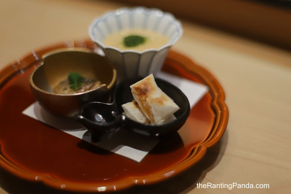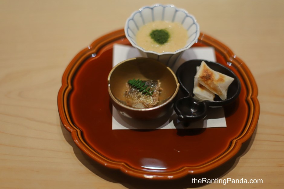 The meal started off with a trio of appetisers where I had sliced tuna topped with grated yam, grilled fish and fried mochi. My first time having mochi this way, and it looks like a mini prata just from its texture.