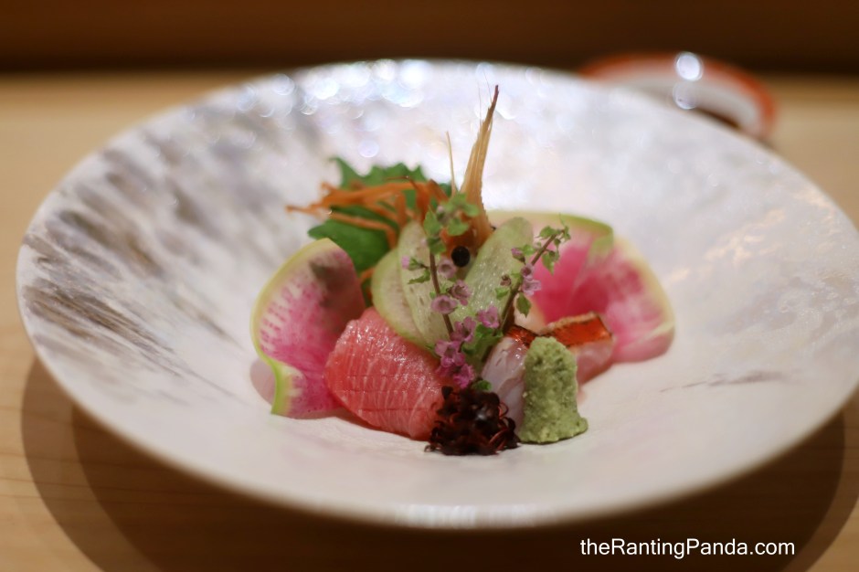 One of my favourite courses in an Omakase, I had a trio of sashimi – Botan Ebi, Kinmedai and Chu-toro. Every piece of the sashimi is fresh and thickly sliced, and I was looking out for an extra piece but to no avail. It also comes with slices of seasonal fresh radish vegetables from Kyoto.
