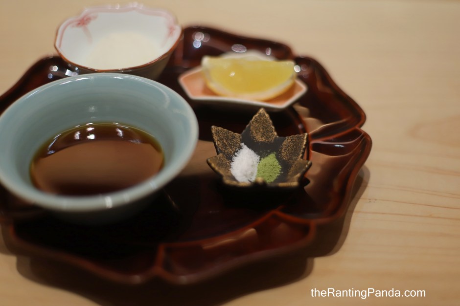 Condiments are served for the tempura such as lemon, sea salt and green tea salt, along with radish and tempura sauce.