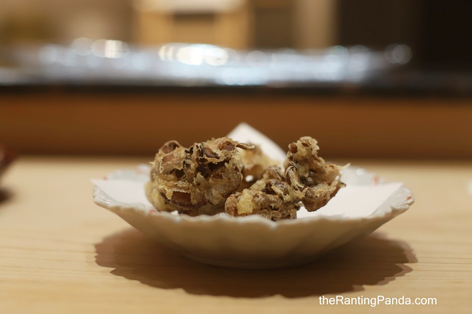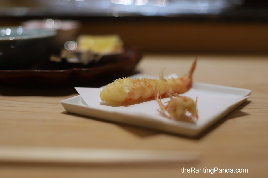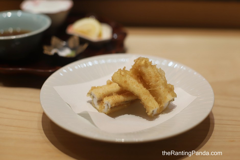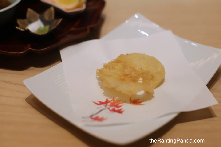 The Ebi course features Kuruma ebi (Japanese tiger prawn) where the prawn head is edible as well. The batter is very light, where the prawn head is extremely crispy and best enjoyed with a pinch of salt.