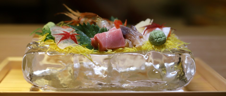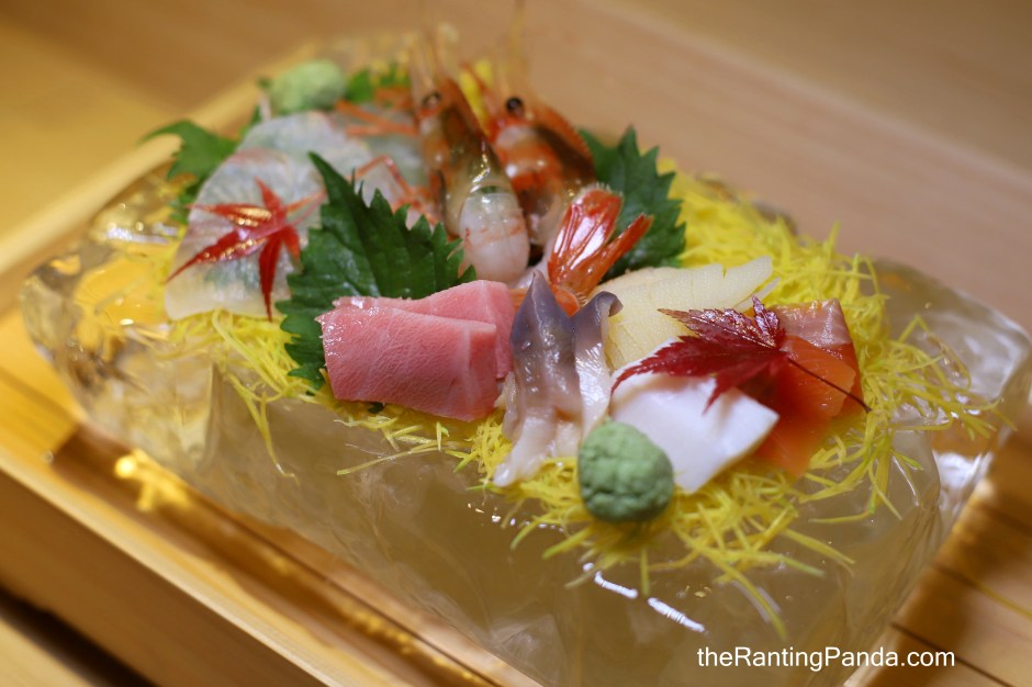 This course features Chef Shinichiro’s Hand-carved Ice Plate Sashimi on a custom-carved clear rock of ice. I had a good variety of fresh Hirame, Otoro, Scallop, Prawn, Cod Fish Egg, Salmon and Octopus Head sashimi layered on freshly shredded slices of pumpkin.