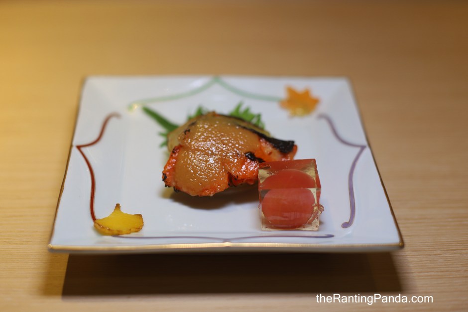 I had the Grilled salmon glazed with miso yuzu, served with a tomato enclosed in a white wine jelly cube.