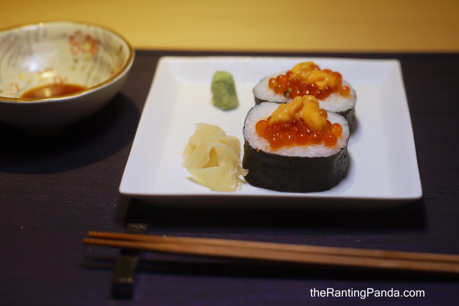 This course features two huge sushi rolls stuffed with Salmon, Tamago, Uni, Ikura and Tuna.