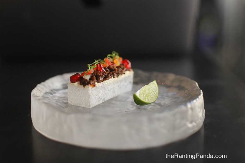 A beautiful work of art, that is my first impression of this course. The ingredients sit atop a delicate looking crystal block, where potato starch and arrowroot are hydrated before being fried to create that clear and delicate crystal texture. Great seasoning of the beef where it packs a burst of flavours along with the spices.