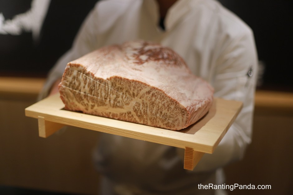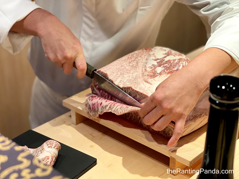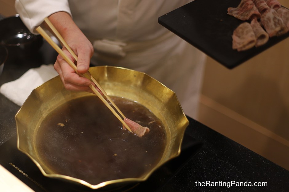 I was expecting a piece of steak but am happy that this course is done shabu-shabu style. The Japanese A5 wagyu beef from Tokachi in Hokkaido is cooked in a katsuo dashi and is topped with nira or garlic chives. Check out that beautiful marbling of the beef.