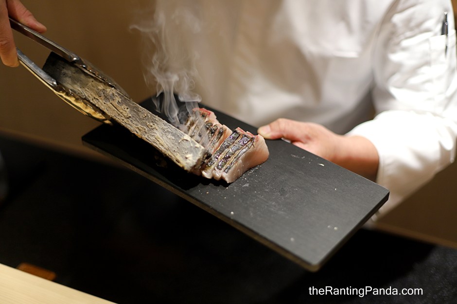 This is one of my favourite acts of the meal. I love the buttery Spanish mackerel which is torched using charcoal. It is full of umami and the texture of the fish is perfect.