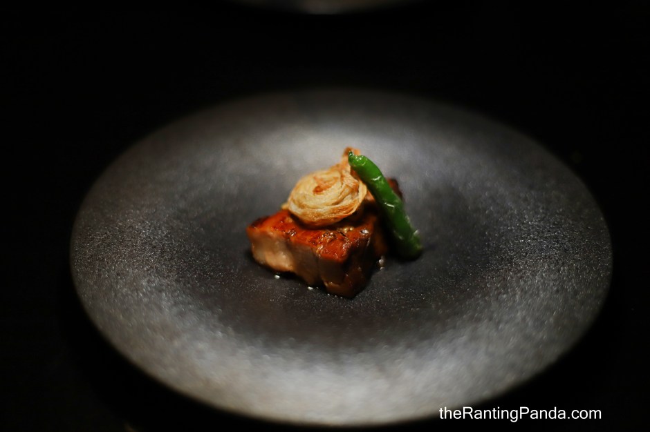 Another signature dish is the Slow Cooked 24-Hour Miyazaki Pork Belly (S$58), made with a rare breed Kannonike Pork from the cross breed of three different species arriving from the Takagi-cho, Miyakonojo City and the Miyazaki Prefecture. The belly is first vacuumed packed for 12 hours before being cooked sous-vide for the second time with soy sauce, mirin, ginger and garlic. The pork is then grilled on hot charcoal to create a delicious char siew like texture. Expect a tender and very flavourful pork belly dish.