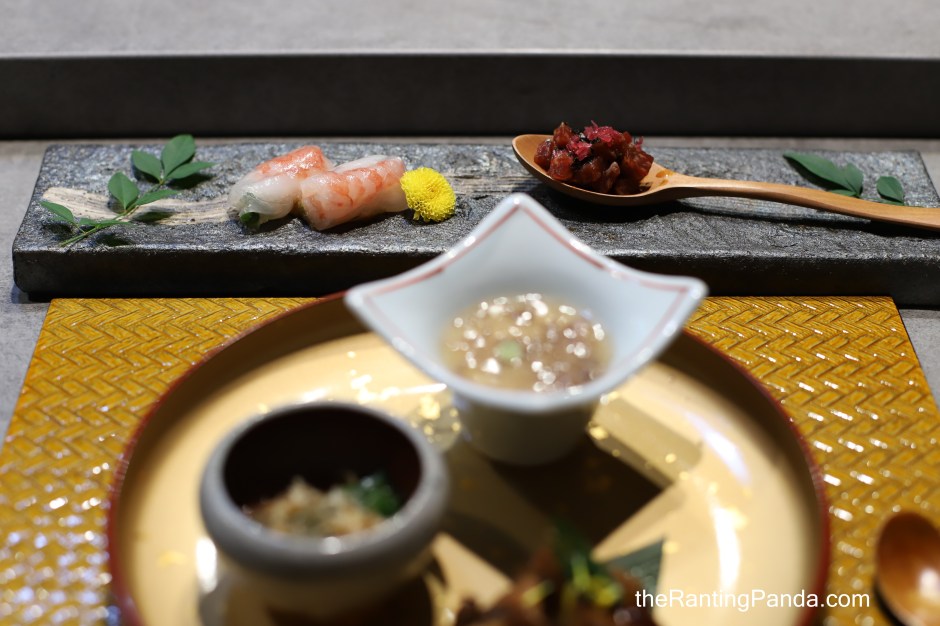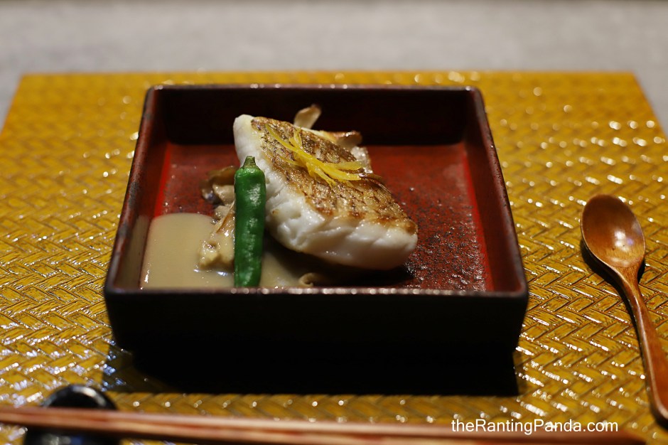 I love dashi, and this course showcases Bonito Soup with ‘Burnt’ Minced Wagyu, Thinly-sliced Miyazaki A4 Wagyu and Shredded Vegetables. The dashi broth here includes beef fat too, so it is more flavourful than the usual. I also like that there are bits of beef being showcased in the kaiseki meal thus far.