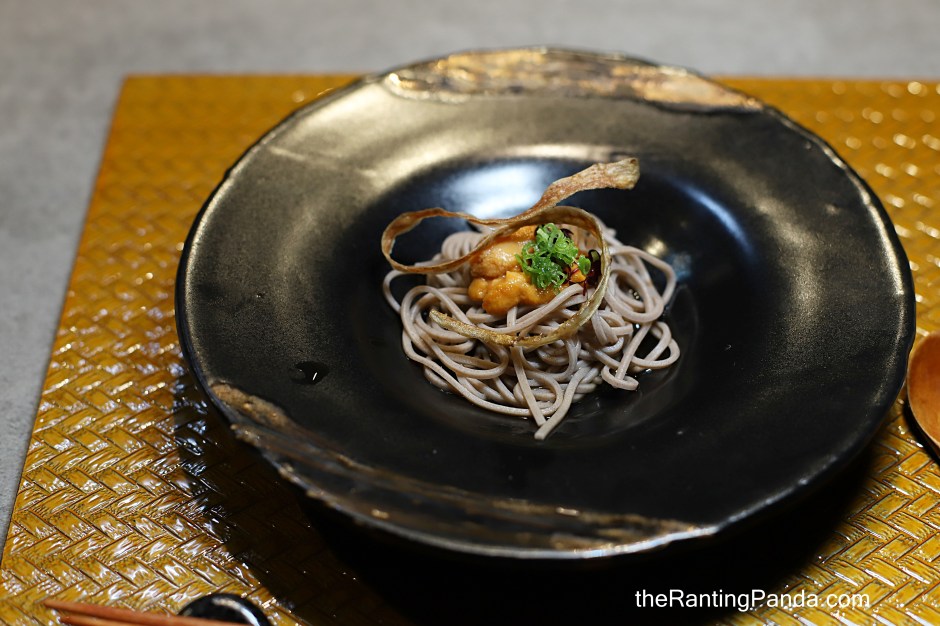 A break from the hot dishes is this Sea Urchin with Soba, Oba Leaf, Nikumiso and Soba Sauce. I love the fresh Bafun Uni along with bits of crisp fried burdock chips.