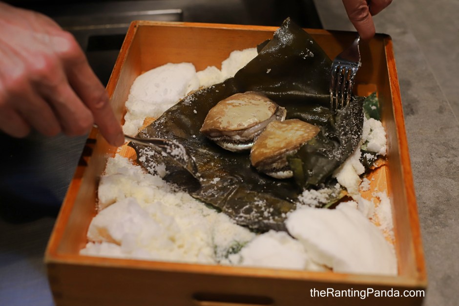 Another seafood course on the menu, the Korean abalone here is covered in konbu and blanketed with sea salt, then steam-baked on the teppan.