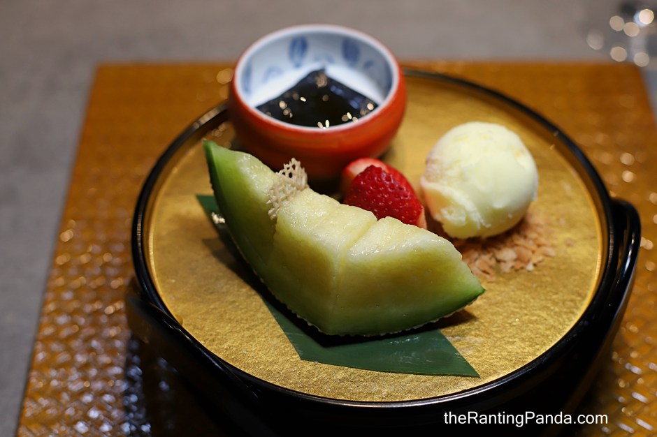 For dessert, I had the Black sesame tofu made with black sesame paste, tapioca powder and water, served with seasonal fruits and yuzu ice cream. It is quite a big portion for dessert where I am easily satisfied just from the fruits.