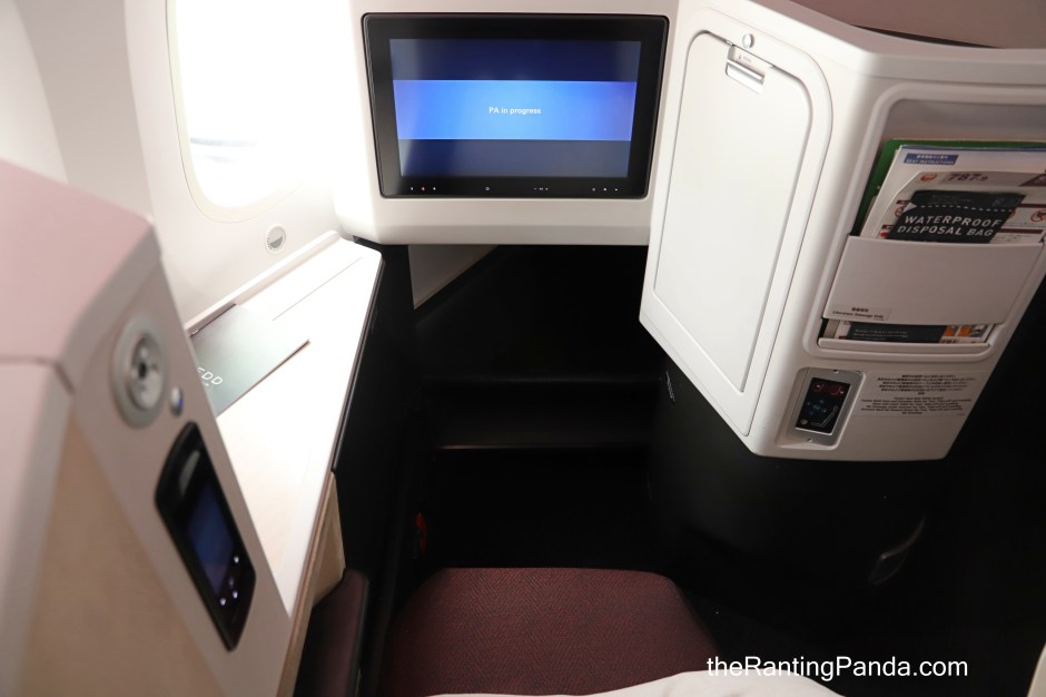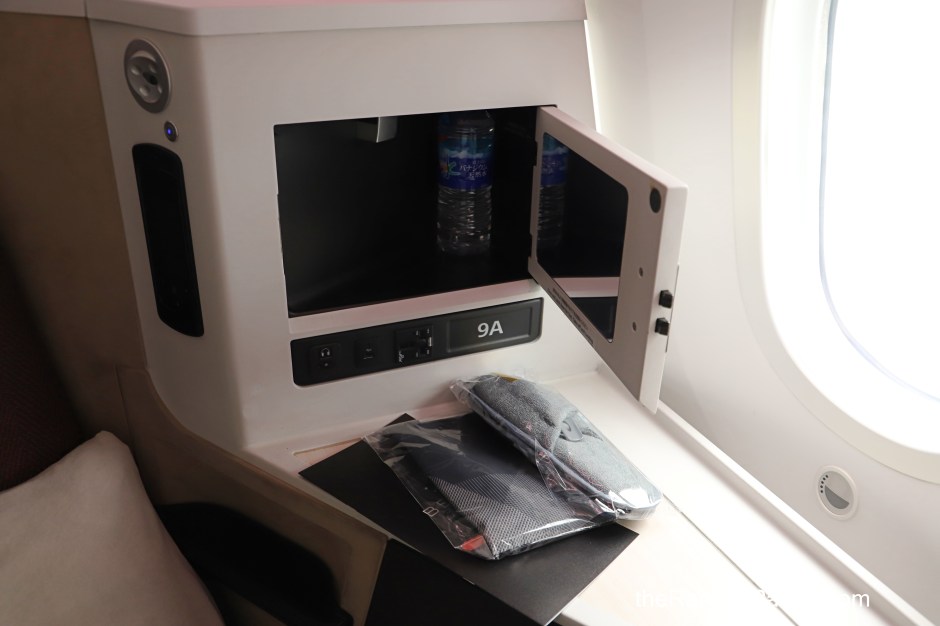 In terms of storage compartment, there is a small storage and & headphone hook (in the storage) along with a vanity mirror. It is not as big as the 787 Business Class on Singapore Airlines, but good enough to store the headphones, a phone charger, water bottle and passport.