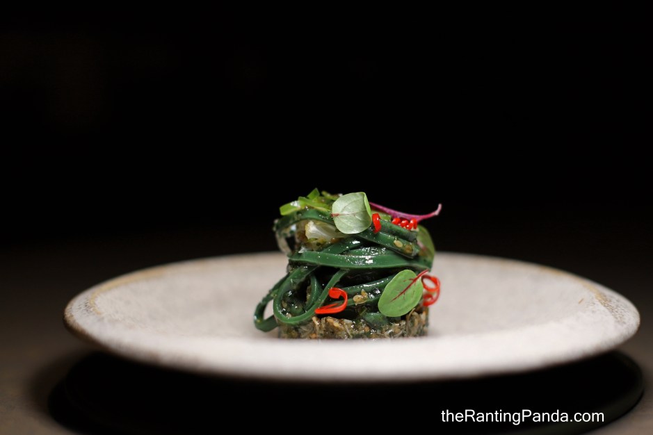 A dish inspired from Nasi Ulam, I was surprised to spot dark green noodles here which is prepared from betel leave juice extract. A rather light and refreshing course, there is also a tinge of chilli padi, pomelo and cucumber.