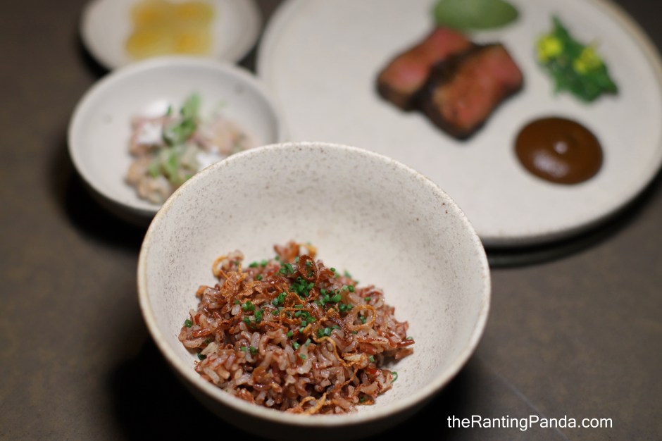 The main course of my meal is beef served with a series of side dishes including salad and sambal. I love the heirloom rice which has been aged for two years, and it goes really well with the sambal sauce.