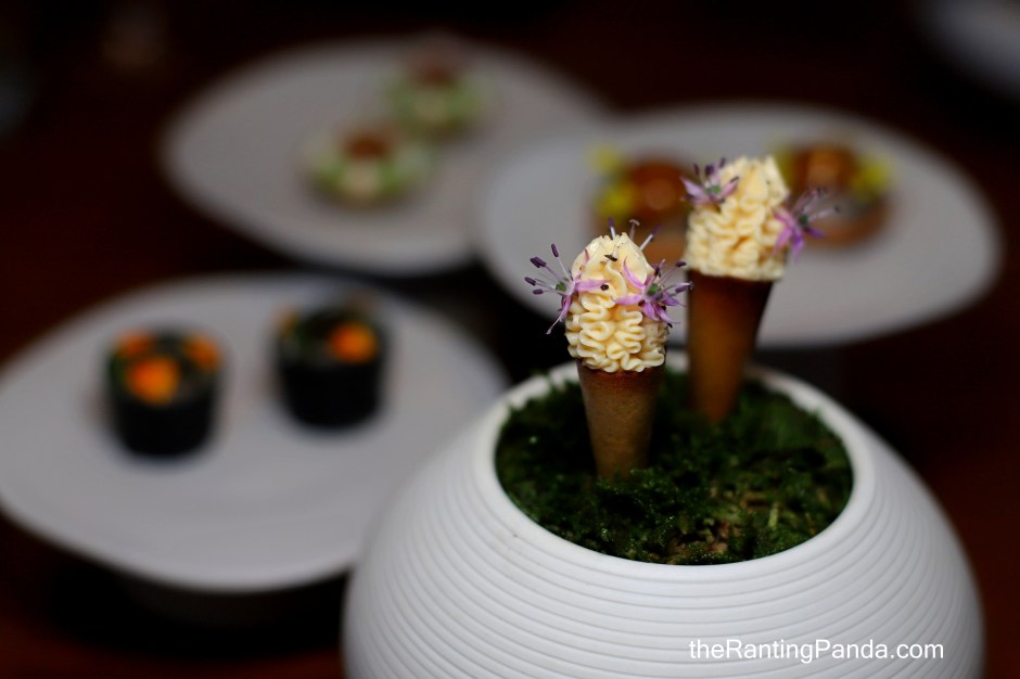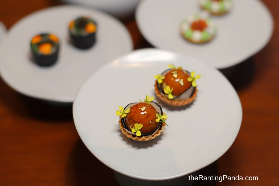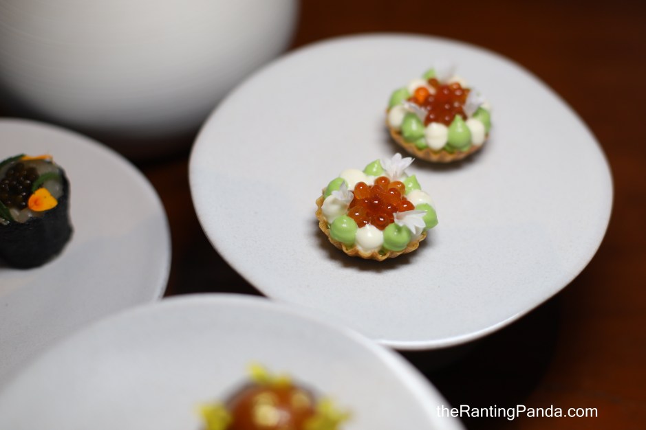 Next up is a series of four snacks – Ankimo glazed in Ponzu with Katsuobushi Cream and Salted Radish; Smoked Eel Rillette with Apple and Marigold; Spring Pea Tartiet with Smoked Creme Crue and Marinated Ikura; and 36 Month Aged Corte Cheese Cornet.
