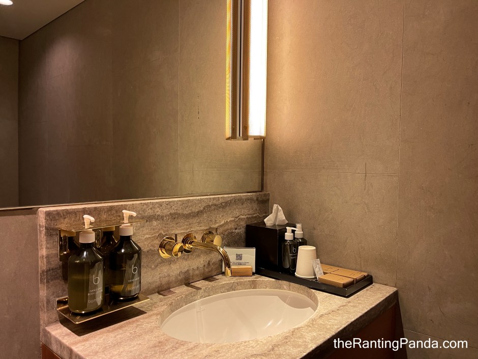 I managed to get a quick shower where the shower cubicle takes on a more masculine dark tone, with ample space to place your bags. The shower zone is a spacious rainforest style complete with Bamford toiletries.