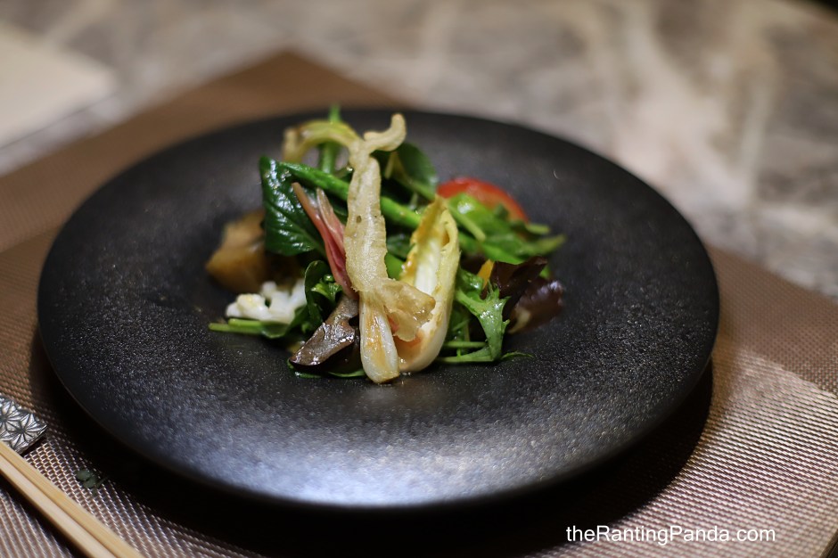 I was sceptical initially when I first saw a Salad as part of the dinner course, but am glad the salad serves as a refreshing intermission course before the main act. For one, it is a beautiful display of pickles and seasonal vegetables such as charred nasu (eggplant), Asparagus, Cauliflower, Tomato, along with a crispy Shima rakkyo fritter – a fried onion bulb from Shima Island in Okinawa. The best part for me is in fact the delicious homemade dressing which is a combination of Japanese root vegetables, sweet sake, fresh herbs.