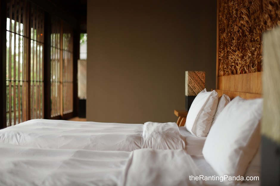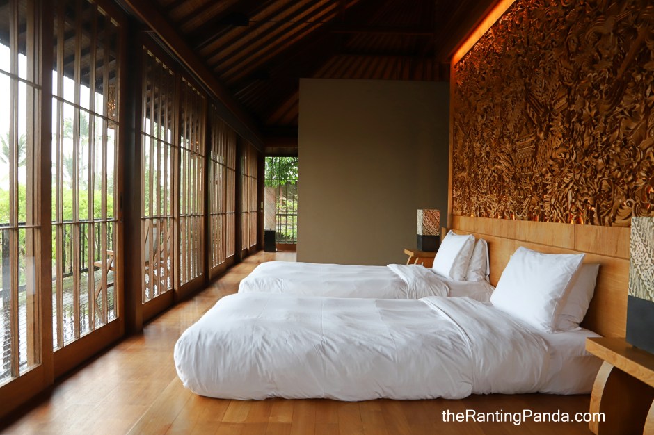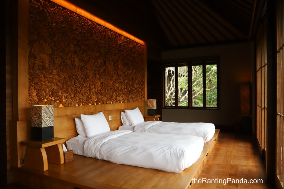 One standout feature of the bedroom design is the huge feature wall, a representation of Ubud culture in the form of woodcarvings. It is beautiful.