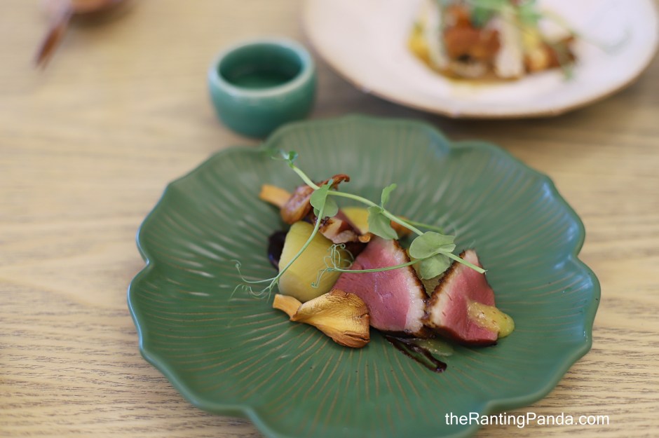 The Red Miso Glazed Duck is paired with local lion’s mane mushroom, eggplant, and mango sauce and it goes with the Atagonomatsu Tokubetsu Junmai (warm) for the beverage pairing.