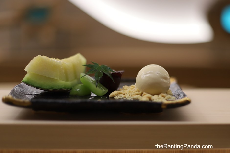 For dessert, I love the Homemade Chestnut ice cream, and it is accompanied by fresh Japanese fruits like Champagne grapes and melon.