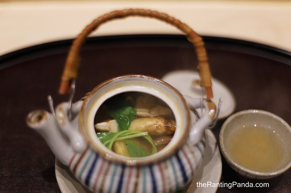 Next up is a soup course served in a teapot-style – a clear comforting dashi broth with some slices of fish meat and mushrooms.