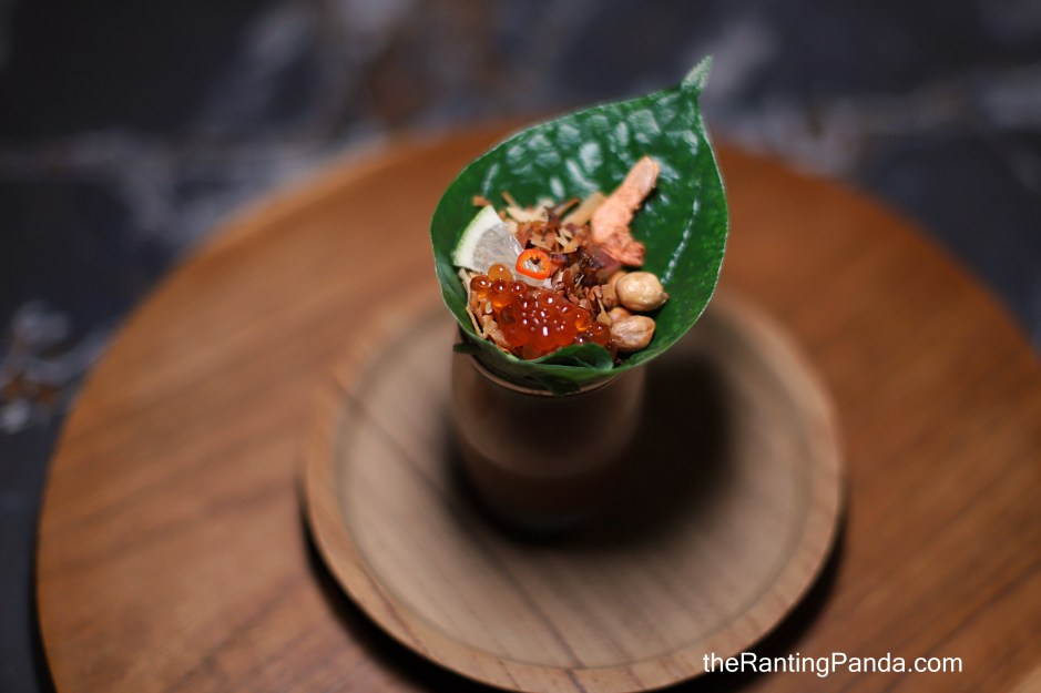 “Miang kham” means one bite snack in Thai and this appetiser is a nice balance of sweet, sour, salty, spicy and bitter flavours. I love the flavours along with the shrimp and it comes with an accompanying sweet, salty and mildly sour drink which consists of Thai tamarind, palm sugar, salt and soda water to cleanse the palate.