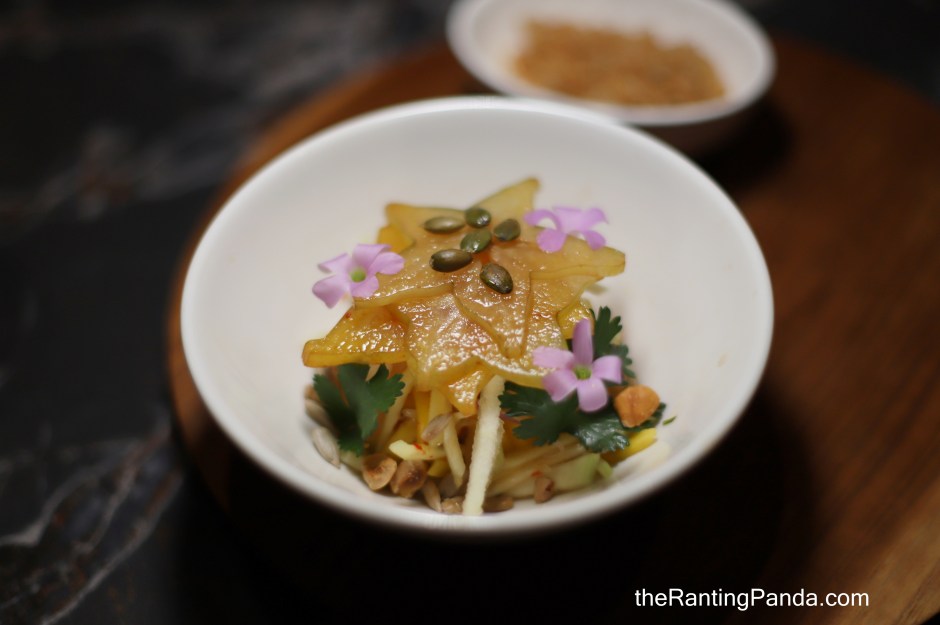 This is one of my favourite courses where Iberico secreto – a thin cut of meat between the shoulder blade and the loin – is marinated with a Northern Thai flavour combination of herbs and aromatics like coriander root and garlic. The delicious pork is then charred over charcoal flames and basted with palm sugar for a subtle sweetness and caramelisation. It is very tender as well, and it does not need any extra condiments to taste good.