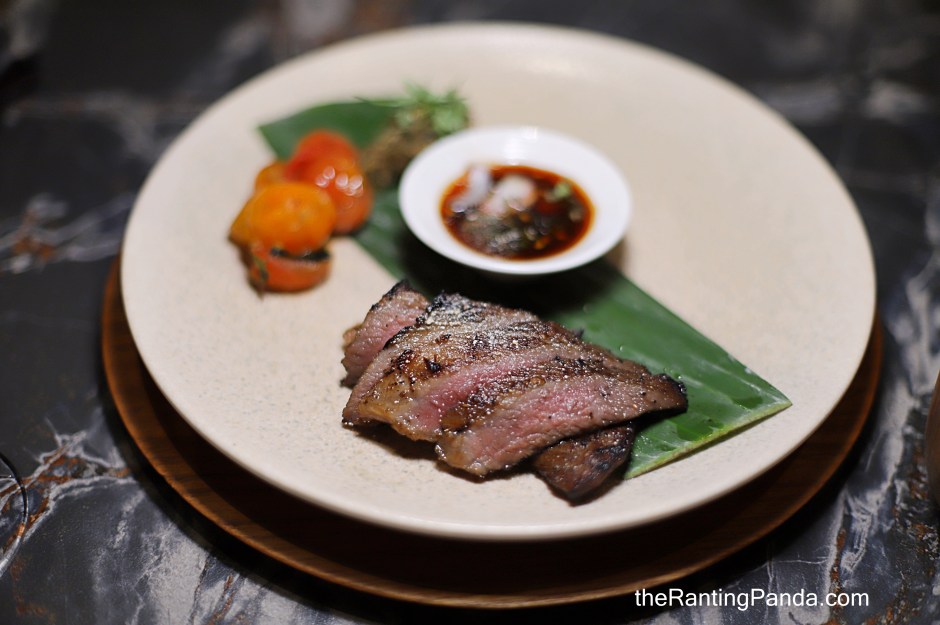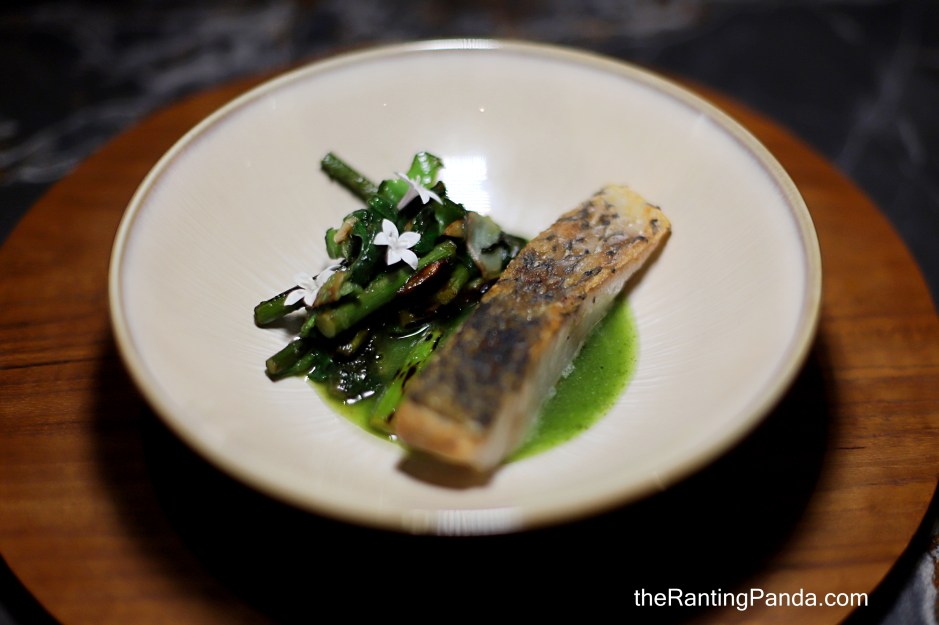 The snapper here is dry aged for 2 days and then pan fried and finished over charcoal grill. It is served along with nam jim (a Thai seafood sauce), with garlic sprouts, ladyfinger and baby spinach. The overall flavours of this dish are slightly spicy and sour.