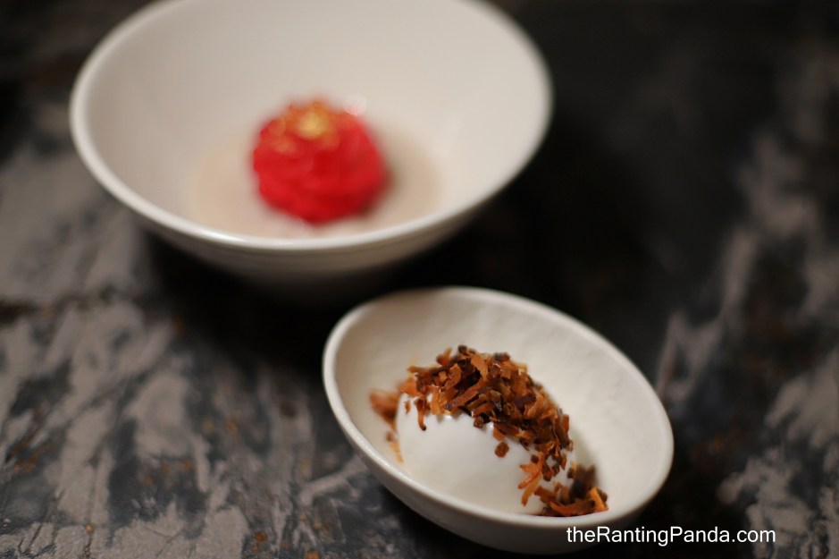 A palate cleanser here with a sorbet of soursop with zest of kaffir lime and pomelo pulp on the top.