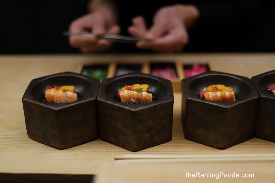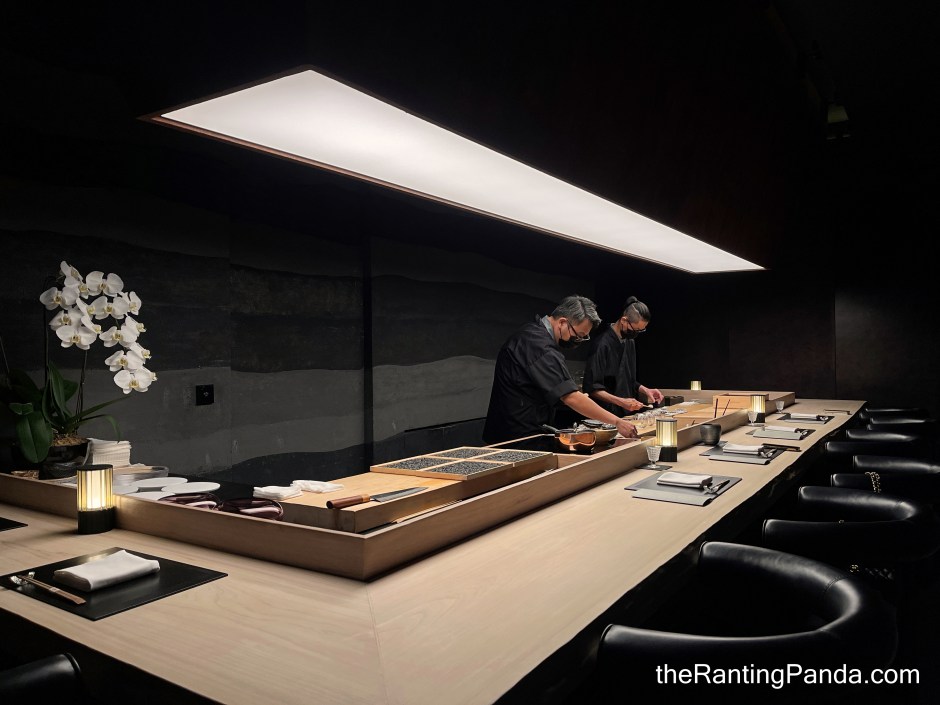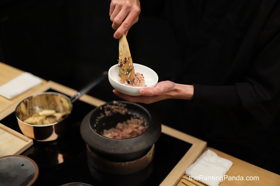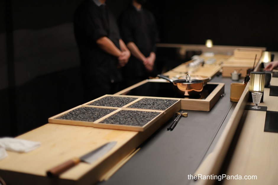 It is a cosy, minimalistic designed interior which is elegant, where diner sit around the Japanese hinoki wood counter. It is nice to watch the chefs at work in the open kitchen as they prepare each course.