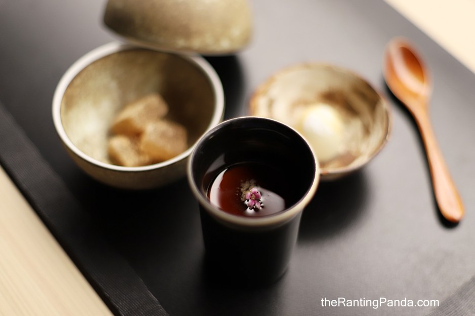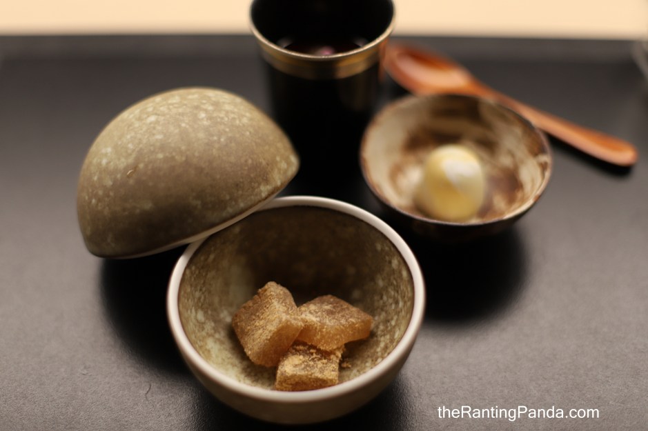 The last part of sweets is a homemade chocolate bon bon with genmaicha ganache filling and white chocolate crispy balls encased in a white chocolate shell, as well as warabi mochi with kinako.