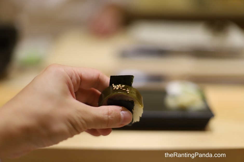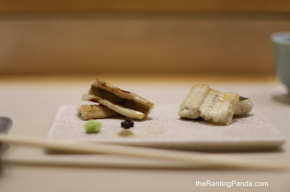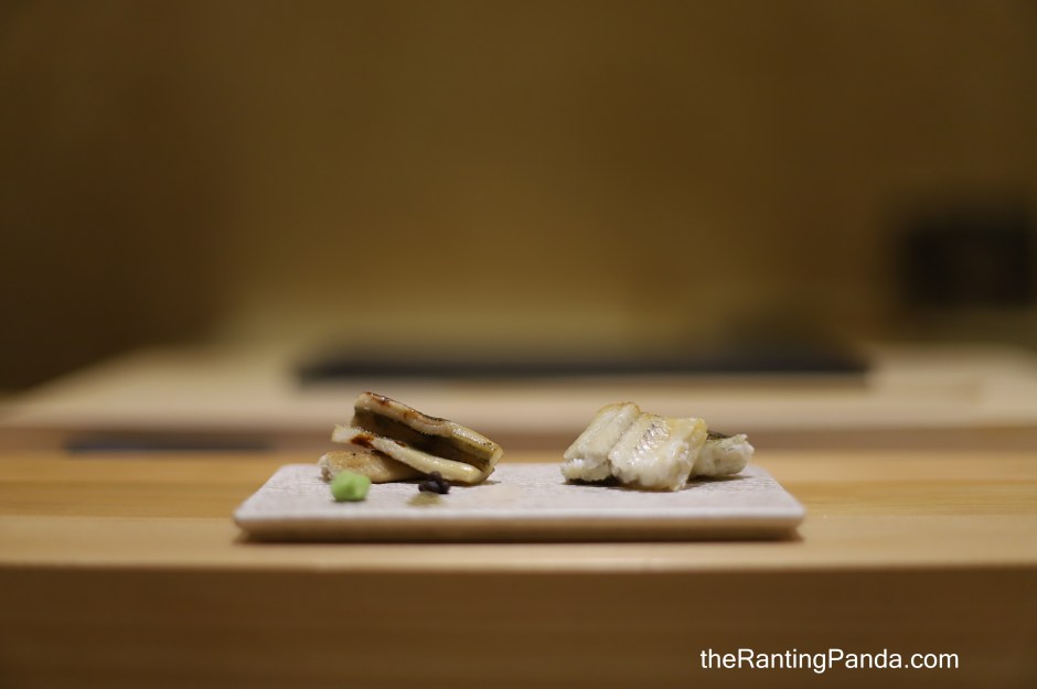 Sea eel and river eel from Aichi Prefecture are presented side by side, accompanied by a series of condiments: Wasabi, a special seaweed crystal salt, Sansho pepper and pickled Sansho. I definitely prefer the Unago (on the right side) more where the skin is more crisp, and the flavour of the fish is fattier.