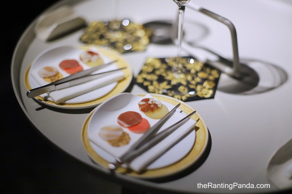 The Food Progressive Thai-Chinese cuisine takes centrestage at Potong which offers a 20-course Tasting Menu. The food at Potong focuses on five elements – salt, acid, spice, texture and Maillard. As I visited during the festive period, the menu I had was the Festive Menu (THB 8000++ per guest) which includes a complimentary glass of welcome Grand Cru Champagne. The usual price for the Tasing Menu during non-festive period is THB 5500++ per guest.