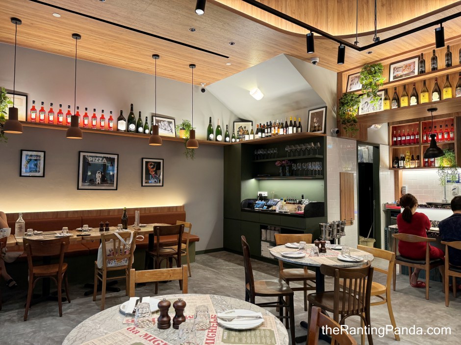 The interior of the restaurant is contemporary chic and exudes a cosy vibe with mainly wooden brown furniture. It features a semi-open kitchen where you can get a glimpse of the specially imported oven from Italy.