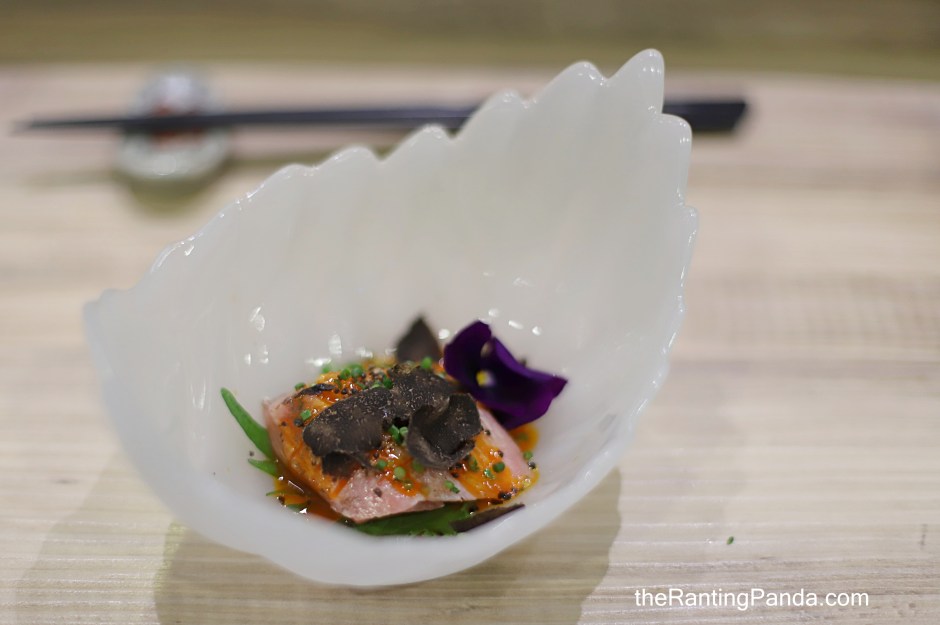 Kama-Toro is the back cheek part of Tuna, and the Kama-Toro here goes with Kagoshima egg yolk, Black Truffle and kombu where the Kama-Toro was slightly torched over with binchotan.