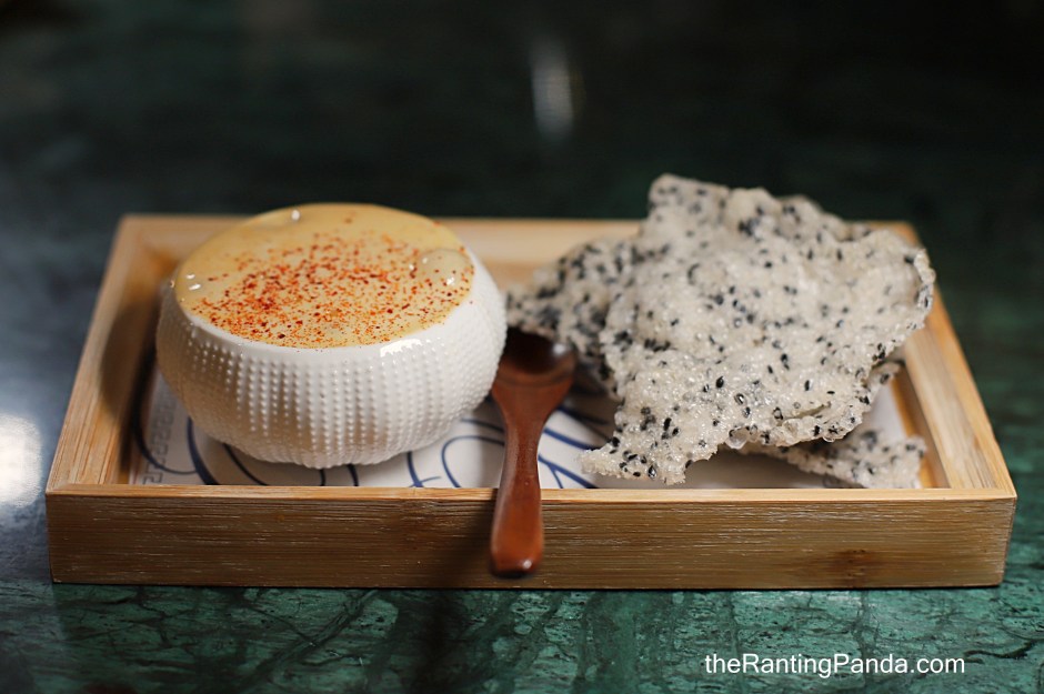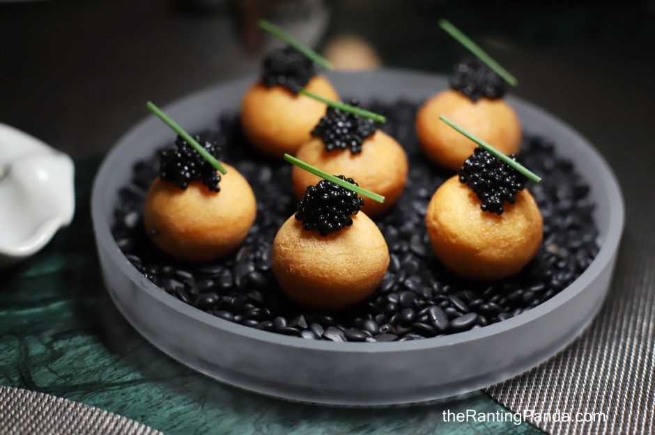 My dinner started with a series of snacks where I had the Squid Ink Kueh Pie Tee (S$12.90/4 pieces) where the squid ink shells are filled with crab meat, jicama cooked with hae bee hiam, and XO sauce; as well as the Smoked Pu Er Caviar & Beignet (S$9.90/2 pieces) where the beignet batter is foamed for an airy texture when fried and filled with yuzu crème. This is quite good value since you get Avruga caviar smoked in-house with pu er tea atop the beignet.